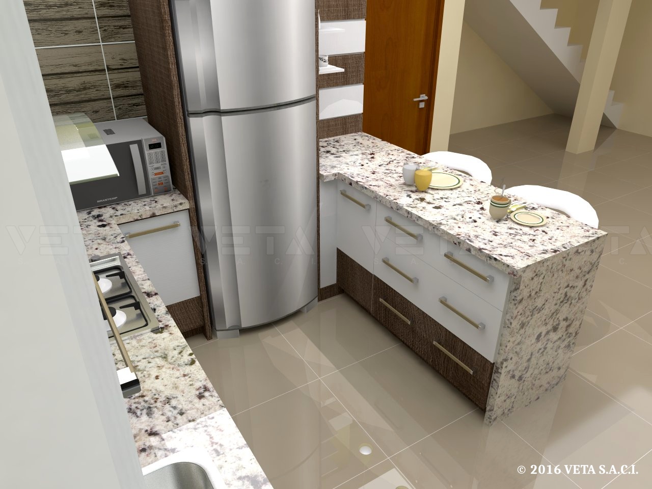 En el lado derecho y en la mesada del barsito se destacan los colores combinandos por medio de franjas horizontales. La mesada en granito blanco dallas contempla los colores gris, marrón, marfil y blanco, la cual luce también impecable e integrada de forma sublime al equipamiento de cocina.