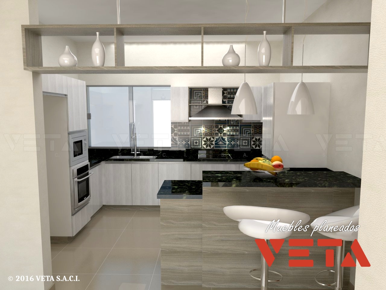 La claridad en el acabado del mueble junto con los detalles plateados de la perfileria, electrodomésticos y campana finalizan con una mesada en granito la cual brilla a los ojos!
